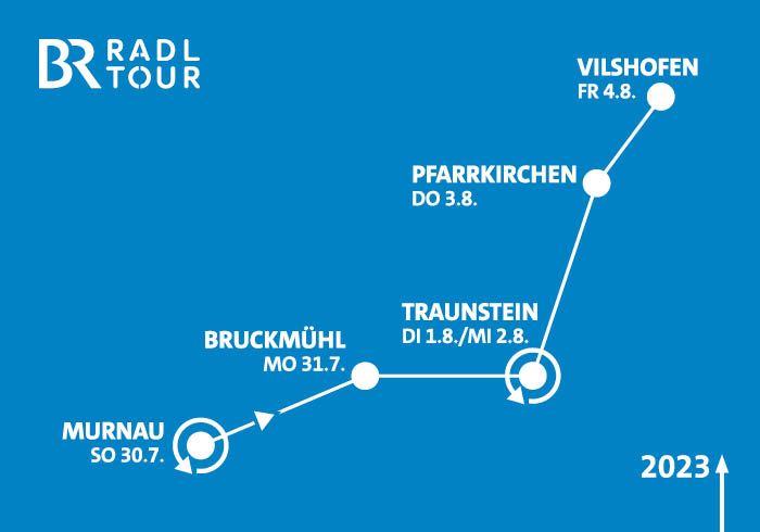 Tagsüber radeln – abends feiern: Das ist das Motto der BR-Radltour, die 2023 zum 32. Mal durch den Freistaat rollt. Los geht es mit einem Rundkurs am Sonntag, 30. Juli, in Murnau am Staffelsee. In jedem Tour-Ort warten auf alle Radelnden sowie Besucherinnen und Besucher tolles Entertainment und hochkarätige Popkonzerte bei freiem Eintritt.